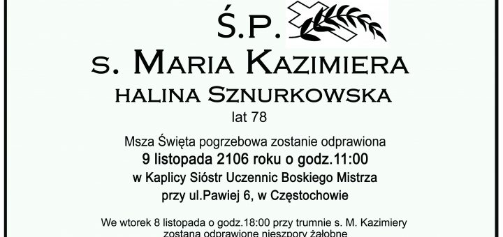 4 listopada 2016 roku o godz. 2.55 w szpitalu w Olsztynie, Jezus Boski Mistrz powołał do Siebie swoją Uczennicę, s. M. Kazimierę (Halinę Sznurkowską), urodzoną 5 listopada 1938 roku w Topiłówce k. Augustowa. Pogrzeb...