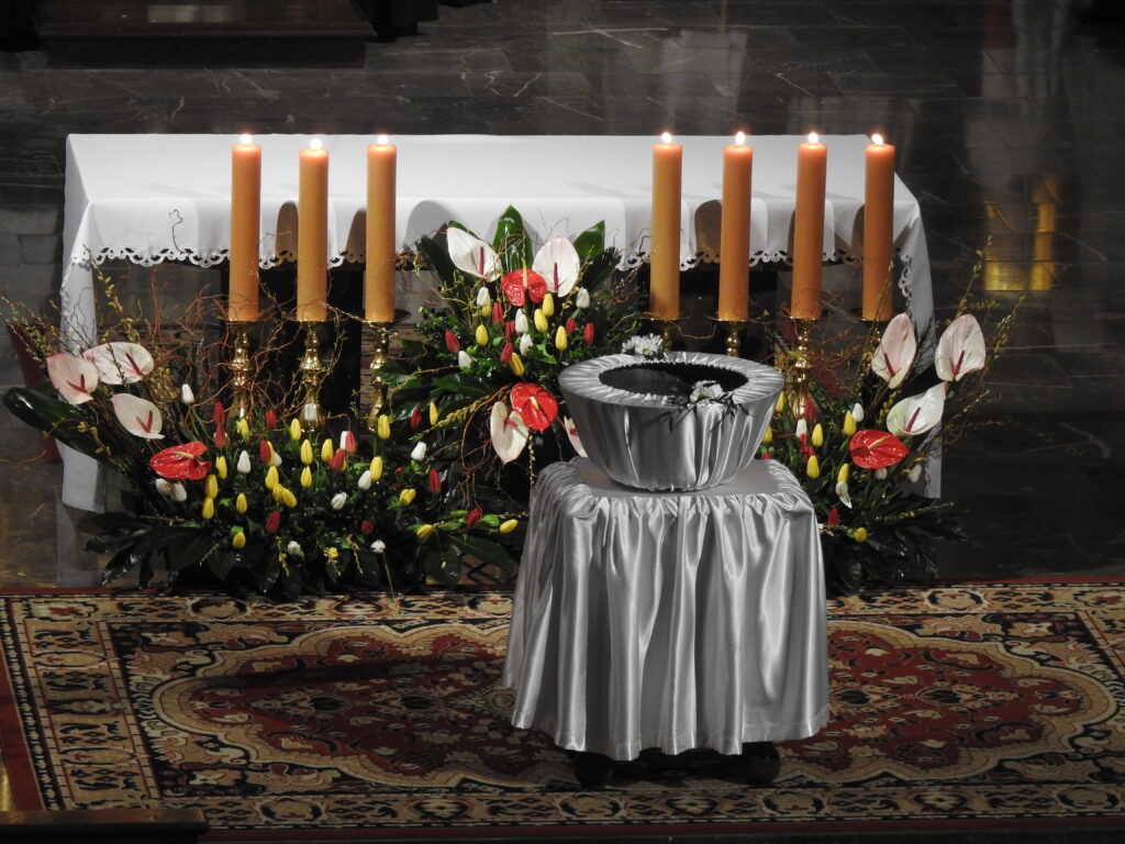 Liturgia światła, która jest prologiem tej Nocy, już na samym początku uświadamia nam, że wielokrotnie droga naszej wiary wiedzie przez ciemności, nieufności, braki miłości, śmierci przez grzech i w grzechu. Cała liturgia rozpoczyna się na zewnątrz, gdzie kapłan od poświęconego ognia zapala Paschał – symbol Chrystusa Zmartwychwstałego, którego światło prowadzi nas po drogach wiary ku zbawieniu. Blask tej świecy, tak bardzo wyróżniający się w ciemności naszych świątyń wskazuje na to, że centralnym punktem naszego życia duchowego, sakramentalnego, życia wiary musi być Chrystus Zmartwychwstały. Budując na tej prawdzie, koncentrując się na Nim stajemy się Kościołem – wspólnotą, która otrzymała nowe życie przez zanurzenie w śmieć i zmartwychwstanie swego Pana i Mistrza. Symbolem, znakiem wspólnoty Kościoła jest sposób zapalania naszych świec. Światło do naszych świec przyjmujemy od Chrystusa zmartwychwstałego – przez pośrednictwo braci i sióstr. Osiągamy zbawienie indywidualnie, przez naszą osobistą relację z Chrystusem, ale pomaga nam w tej drodze zbawienia wspólnota. We wspólnocie Kościoła nie chodzi o to, aby być grupą osób samowystarczalnych i doskonałych we wszystkim, ale by być wspólnotą ludzi wzajemnie siebie potrzebujących, otwartych na przyjęcie innych i gotowych do dawania siebie. Do tego wzywa nas Chrystus, ten ukryty w symbolu Paschału, Ten dający nam nowe życie przez zwycięstwo nad grzechem i śmiercią.