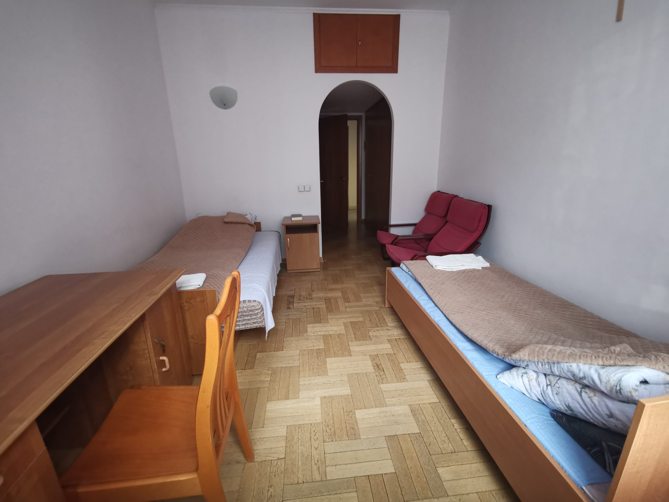 Mamy do zaoferowania pokoje jedno lub dwuosobowe, większość pokoi jest z łazienkami. W pokojach są ręczniki. Nie serwujemy posiłków, dla gości jest kuchnia z kuchenką i lodówką gdzie można sobie przygotować posiłek oraz jadalnia.