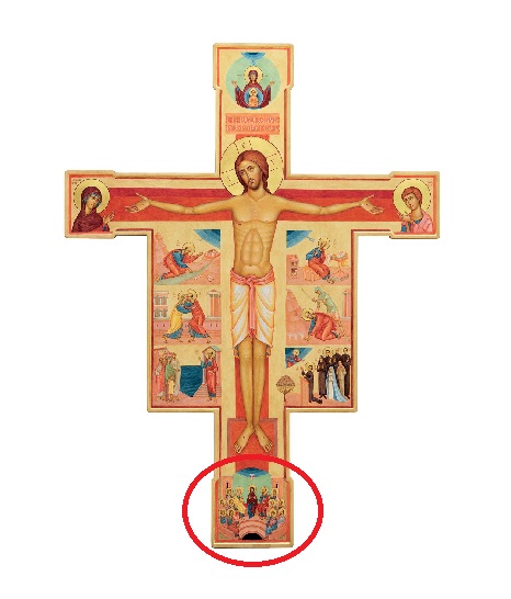 Krzyz Swietego Pawla sierpien 2013U podstawy Krzyża znajduje się ikona Pięćdziesiątnicy. Trzynaście postaci znajdują się pomiędzy dwiema wieżami, co ma oznaczać najwyższe piętro domu, salę na górze, czyli Wieczernik, gdzie wcześniej apostołowie spożyli z Jezusem Ostatnią Wieczerzę. Po Jego zmartwychwstaniu spotykali się tam na modlitwie. Sala jest otwarta ku górze, gdzie na niebiańskim półkolu widnieje Duch Święty w postaci gołębicy.